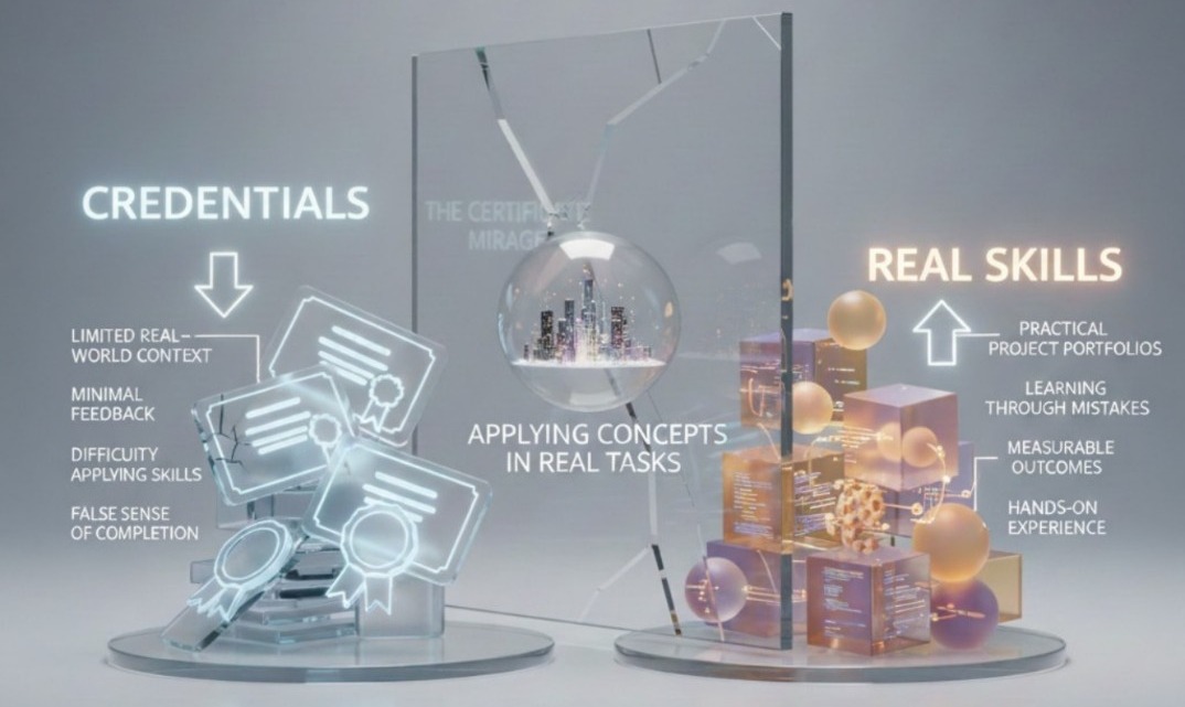 In today’s digital era, online certifications have become extremely popular. Students often collect multiple badges believing they reflect expertise. However, a certificate only shows that a course was completed—it does not prove the ability to apply concepts in real-world situations.